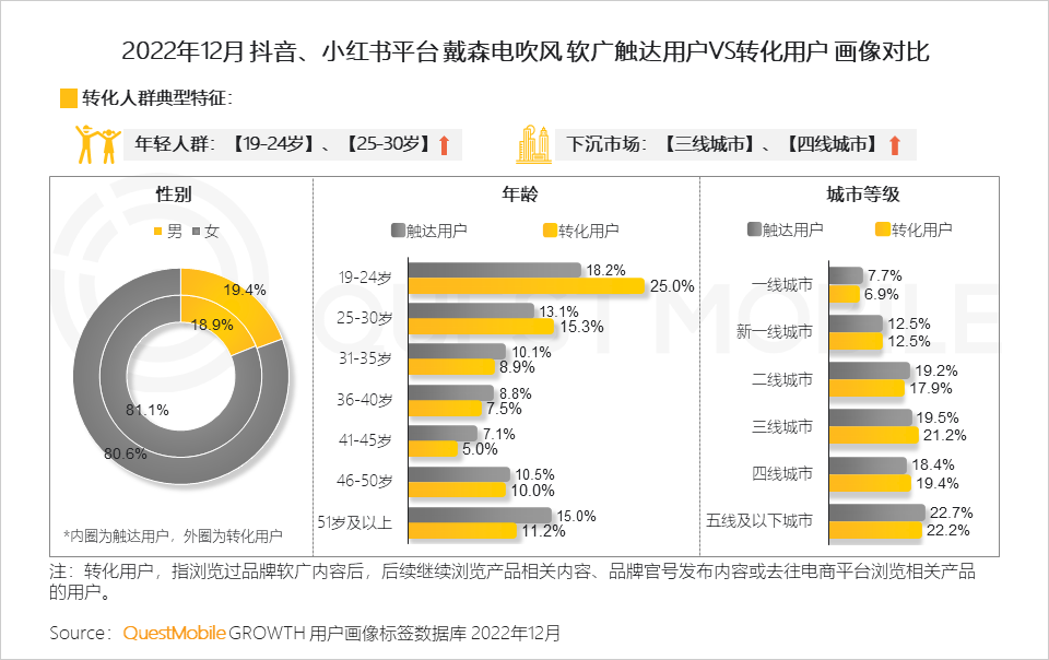 7、戴森的触达用户中以19-24岁人群转化最活跃,但此年龄段用户消费力与戴森产品价格匹配程度较低;此外本波营销内容在下沉市场的较高渗透也一定程度上造成了后续电商转化效果不理想