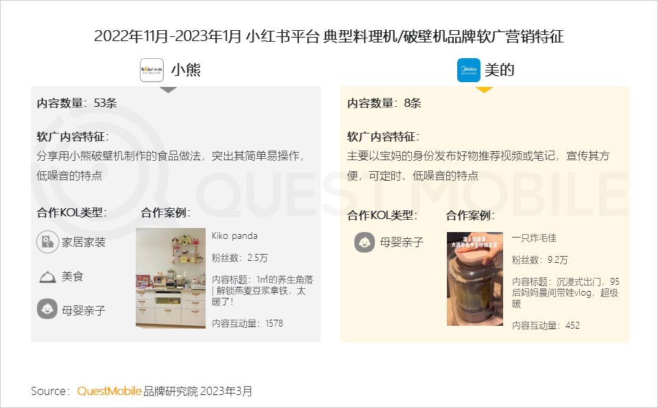 9、值得注意的是,小熊通过与小红书家居家装类达人的合作,籍此传递美好生活的向往,调动用户情绪价值;美的更聚焦母婴亲子类KOL,以揽获宝妈人群的芳心