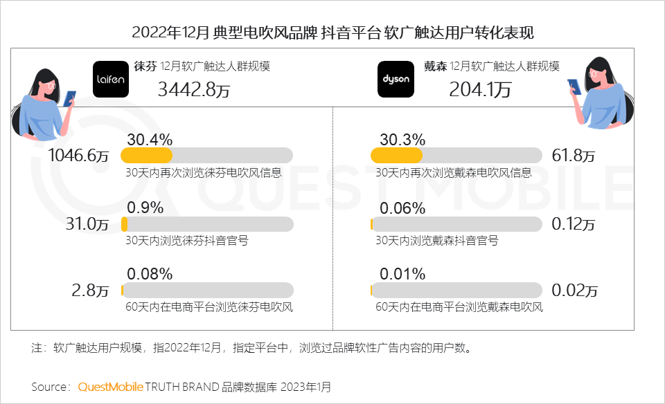 4、以2022年12月数据为例,徕芬在抖音的达人投放共触达3400多万用户,最终成功为其品牌私域渠道引流31万;此外,触达用户中有2.8万“被捕捉到”后续在电商平台浏览徕芬电吹风机