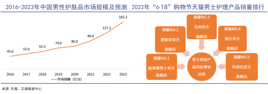 所以也有部分护肤品牌将目光瞄向了男性消费者群体。2021年中国男性护肤品市场规模为99.0亿元,同比增长23.8%;在2022年“6·18”购物节中,天猫平台上的男士护理产品整体销量更是实现了20倍的高速增长。