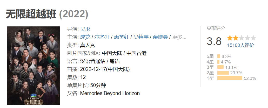 不过,“TVB+内地平台”主打情怀杀的综艺合作并非屡试不爽。由浙江卫视、优酷出品,TVB联合出品的演员专业艺训励志真人秀《无限超越班》以复刻了中国香港无线电视艺员训练班师生教学的授业形式为港剧情怀的切入点,但在豆瓣上的评分仅有3.8分,一星占比52.3%。此外,网友爆料《无限超越班》在香港本土还因民众觉得无聊而遭遇了“停播”,为此TVB重新剪辑适合香港观众的精简版本。