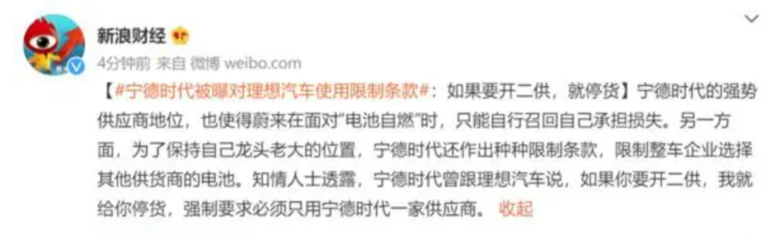 但锂矿返利计划的实施就要求车企要和宁德时代签订“对赌协议”,这也是让车企广为诟病的“霸王条款”。据新浪财经报道,宁德时代和一些车企的协议中包含限制开二供(指的是同时向多家供应商采购),只要合作车企开二供,宁德时代就断货。虽然宁德时代很快否认,但车企依然有众多知情人士不断爆料,宁德时代在行业强大的话语权地位彰显。