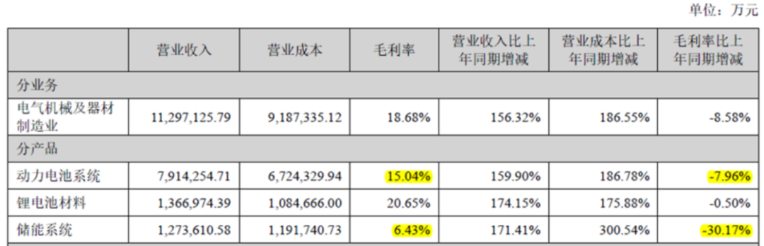 如果从2022年半年报来看,宁德时代的赚钱能力退化更加明显。2022年中报显示,宁德时代的动力电池业务毛利率只有15.04%,同比下滑了7.96个百分点。锂电池材料毛利率为20.65%,下滑了0.5个百分点。储能业务毛利率低至6.43%,同比下滑了30.17个百分点。