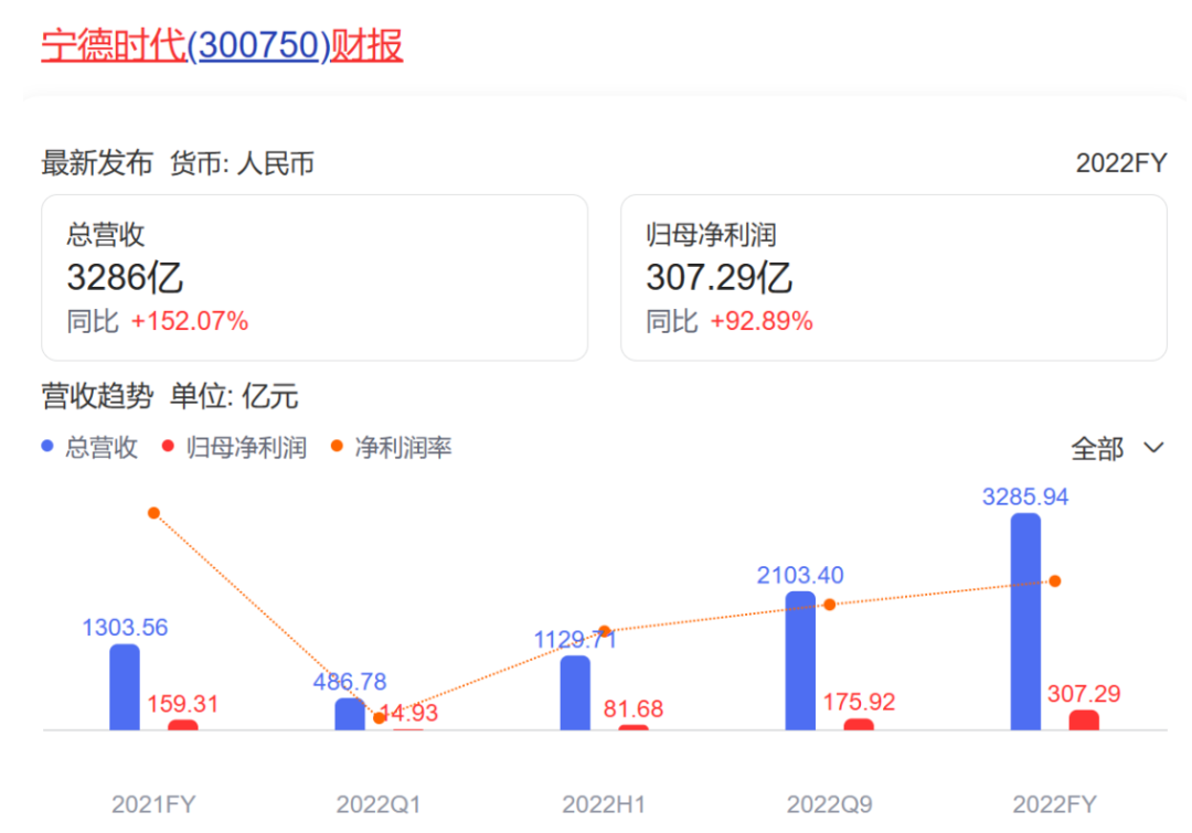 3月11日,宁德时代(300750)发布了2022年报,财报显示2022年,宁德时代总营收3285.94亿元,同比2021年的2103.4亿元增长了152.07%,净利润由2021年的175.92亿元,提升至307.29亿元,同比增长92.89%。