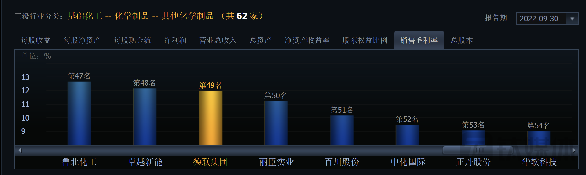 从毛利率上来看,2020年- 2022年前三季度,德联集团销售毛利率呈持续下滑趋势,分别为13.89%、13.44%、11.95%。截止2022年三季度末,德联集团汽车精细化学品、汽车销售和维修这两大主营业务的毛利率均处于下滑状态,分别下滑了0.88个百分点、1.32个百分点。对比同行的销售毛利率来看,德联集团表现也略显逊色,一共62家同行业公司,德联集团排在49位,公司将毛利率下降原因归因于运费归集营业成本以及原材料价格上涨。