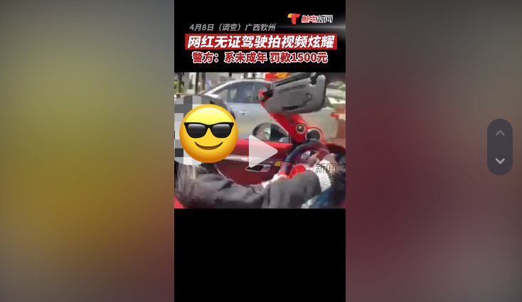 2022年4月8日,广西钦州,警方接网友举报,称一未成年网红无证驾驶拍视频炫耀。民警核查后发现情况属实,对其罚款1500元,同时对她进行了安全教育。