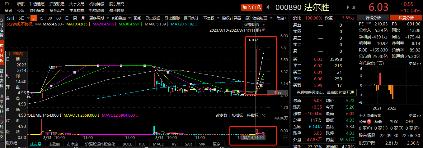 从盘面上看,法尔胜今日低开跌超5%,后续持续走低,截至午间休市,其股价跌幅超7%,午后一度封死跌停。但下午14:40,离收盘尚有20分钟,盘中突然有资金翘板,在几笔大单助攻下,法尔胜由跌停拉升至涨停。