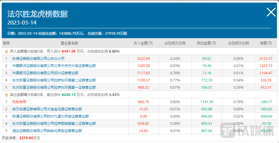 以3月14日龙虎榜数据统计,上榜营业部席位全天成交14.39亿元,且单日净买入近3300万元。其中,东海证券山东分公司净买入近3100万元成为翘板主力,知名游资中国银河证券北京中关村大街、中国银河证券绍兴两大游资常用席位净买入均超1000万元,“散户大本营”“拉萨天团”也上买入榜前五席位,但净买入额仅为303万和401万。卖方席位上,机构合计净卖出 1007.51 万元。从龙虎榜公布的三日买卖数据来看,机构合计净卖出280.77 万元。