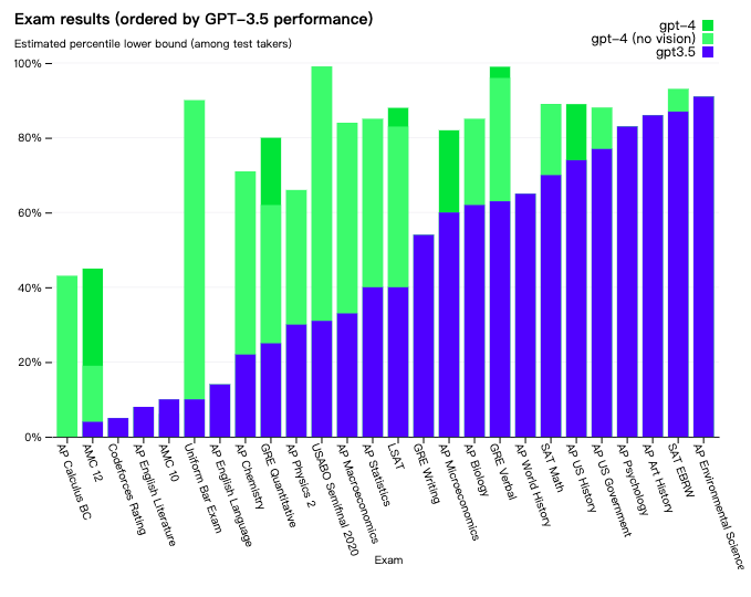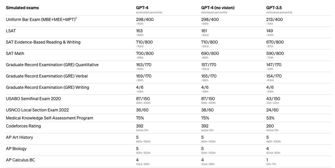 为了解这两种模型之间的区别,OpenAI在各种基准测试中进行了测试,包括人类的模拟考试,比如GRE。OpenAI并没有针对这些考试进行专门培训,但GPT-4的排名依然名列前茅。例如,它通过模拟律师考试,分数在应试者的前10%左右;相比之下,GPT-3.5的得分在倒数10%左右。