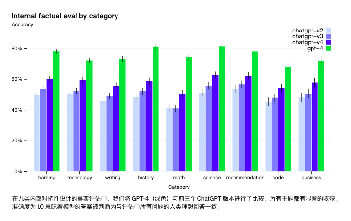 虽然生成内容的可靠性仍是一个真问题,但GPT-4相对于以前的模型显著减少了胡说八道。在OpenAI的内部对抗性真实性评估中,GPT-4的得分比OpenAI最新的GPT-3.5高 40%: