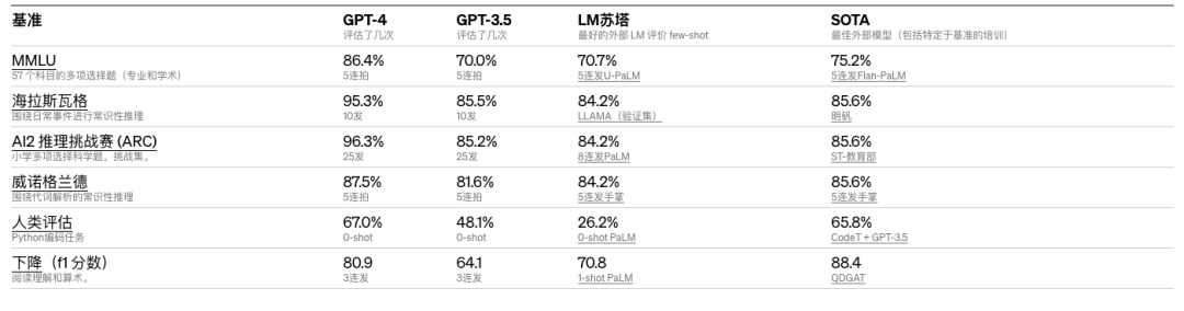OpenAI在为机器学习模型设计的传统基准上评估了GPT-4,大大优于现有的大型语言模型,以及大多数最先进的 (SOTA) 模型: