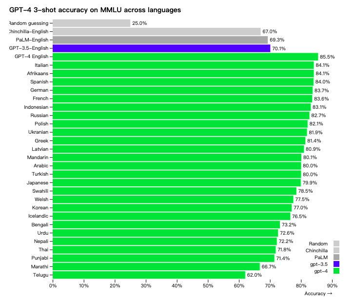 许多现有的ML基准测试都是用英语编写的。OpenAI使用Azure Translate将MMLU基准——一套涵盖57个主题的 14000个多项选择题——翻译成多种语言。在测试的24种语言中,GPT-4优于GPT-3.5和其他LLM(Chinchilla、PaLM)的英语语言性能,包括拉脱维亚语、威尔士语和斯瓦希里语等低资源语言: