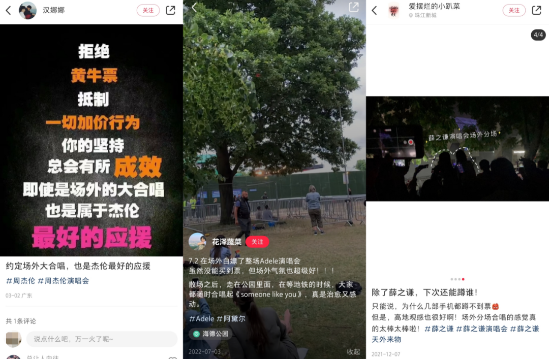 以“演唱会”为关键词检索,微博上每一个相关词条下面都是过亿的互动,而小红书上则是各种抢票指南。