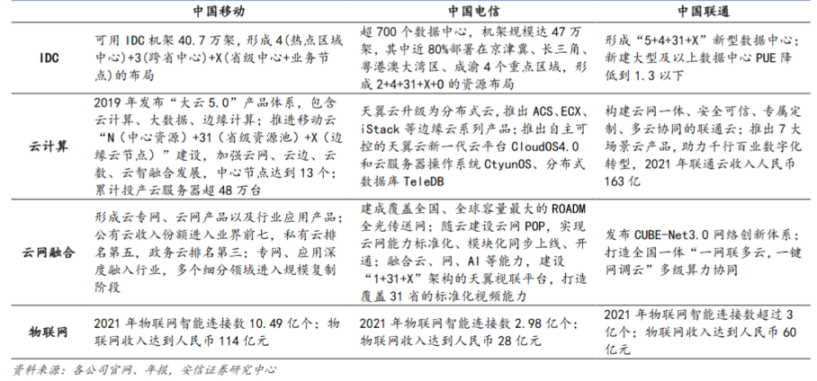 目前,运营商的云资源池和边缘节点已经初具规模,作为通信基础设施的建设方和运营方,丰富的云网资源能够更好地服务于企业数字化转型,这也促进了三大运营商资本开支的转型。三大运营商都公开表示在算力网络建设上的资本开支还将不断加大。