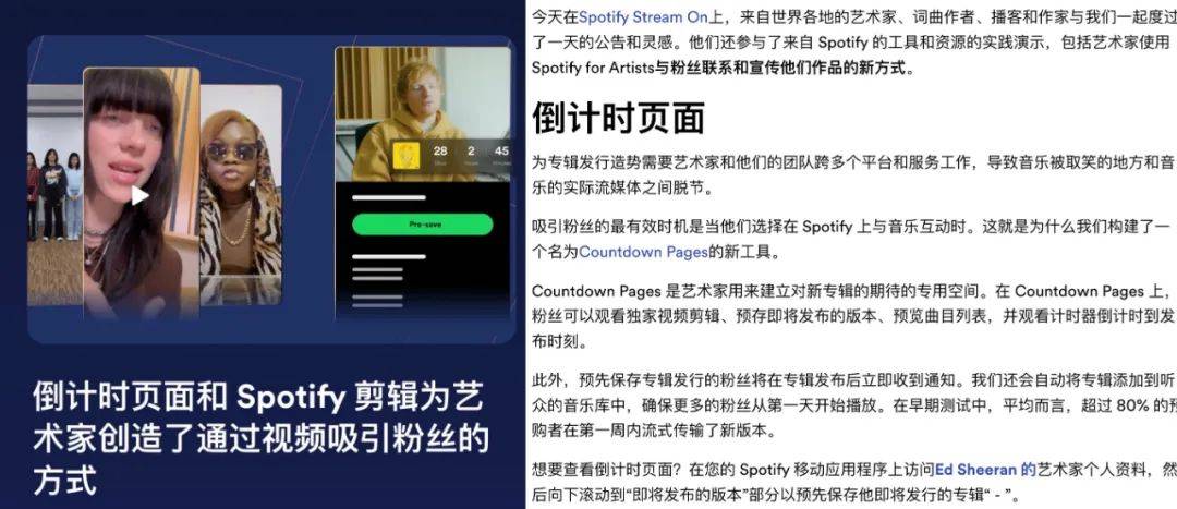 Spotify认为,当今音乐人吸粉的最有效时机就是在Spotify上与粉丝互动之时。为此,Spotify推出了「Countdown Pages」的新功能,以帮助音乐人在发歌前用独家短视频、预览曲目列表、专辑发布倒计时等“可视化内容”做预热。