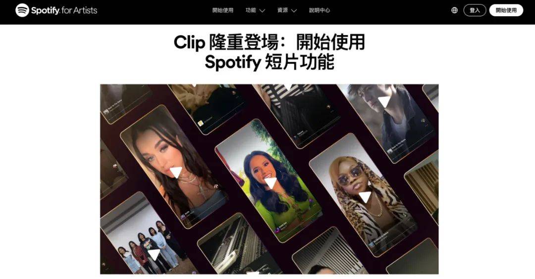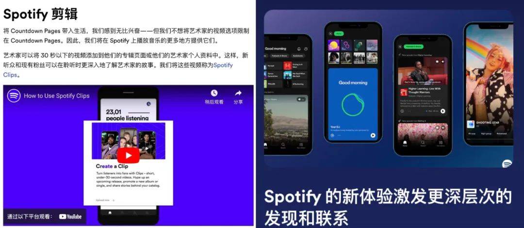 在犀牛君看来,Spotify此次更新几乎把“短视频元素”全面融入到产品的各种使用环节。例如,新功能「Countdown Pages」可帮助音乐人借助独家短视频、曲目列表预览、专辑发行倒计时等进行新歌宣发;「Clips」支持音乐人在资料页、专辑页等更多地方放入“讲述歌曲背后的故事”等内容的30秒短视频。