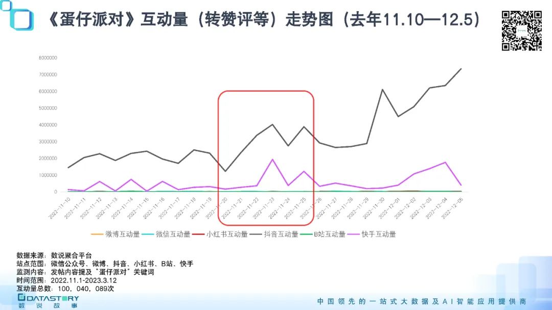 ①之所以判断11月23号抖快的爆量有助推,是因为之前,《蛋仔派对》一直互动量平平,而之后则一飞冲天。