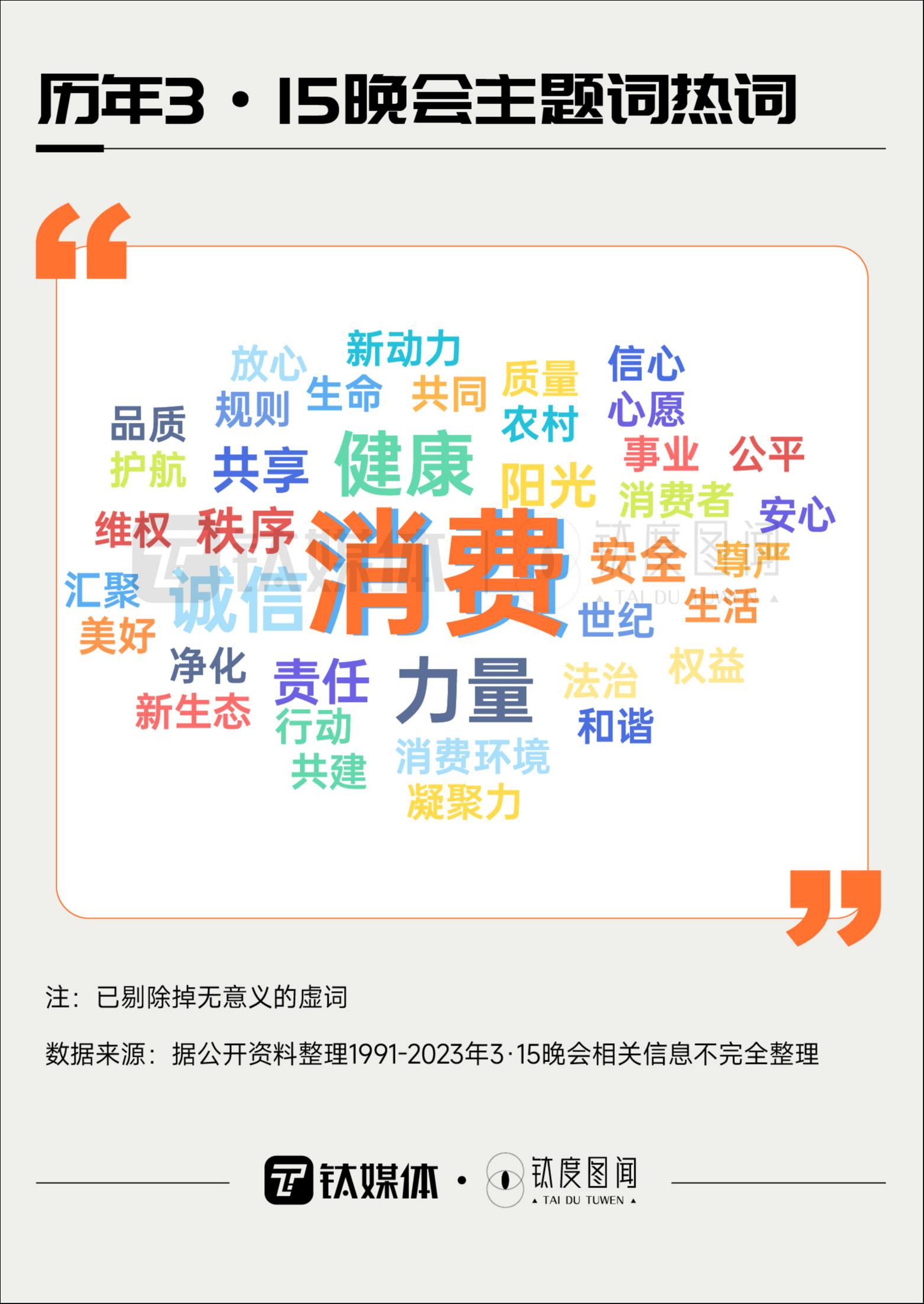 钛媒体·钛度图闻统计历年3·15晚会主题词发现,出现了10次的“消费”是高频热词,体现了3·15晚会主题聚焦消费的方方面面。除此之外,主题词中更多提及“健康”、“力量”、“诚信”、“安全”、“责任”等,体现了晚会对消费环境的净化以及对消费者的保护。