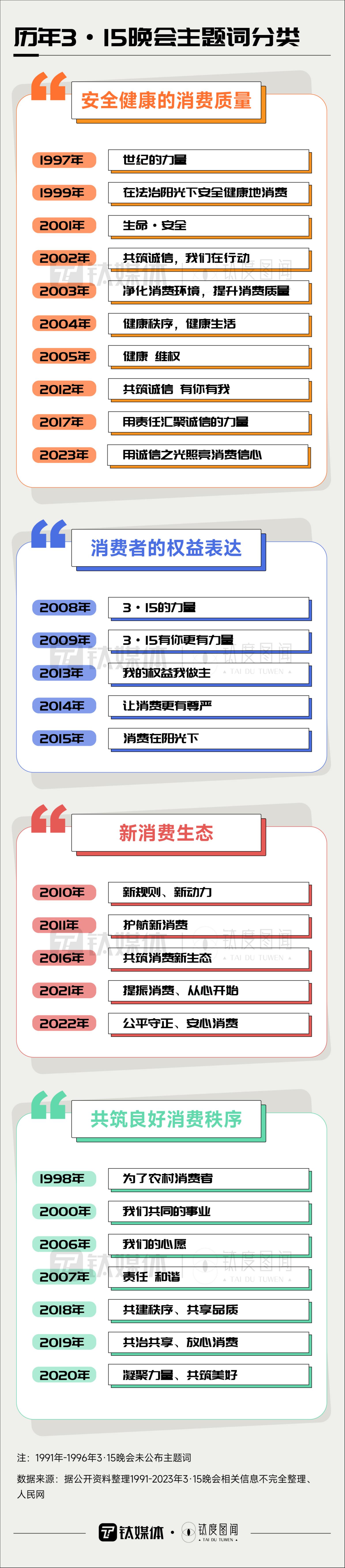 33年里,3·15晚会主题逐渐变化,从“消费质量提升”到“构建良好消费秩序”,每一阶段的主题都透视出各个时代消费者面临的不同问题。
