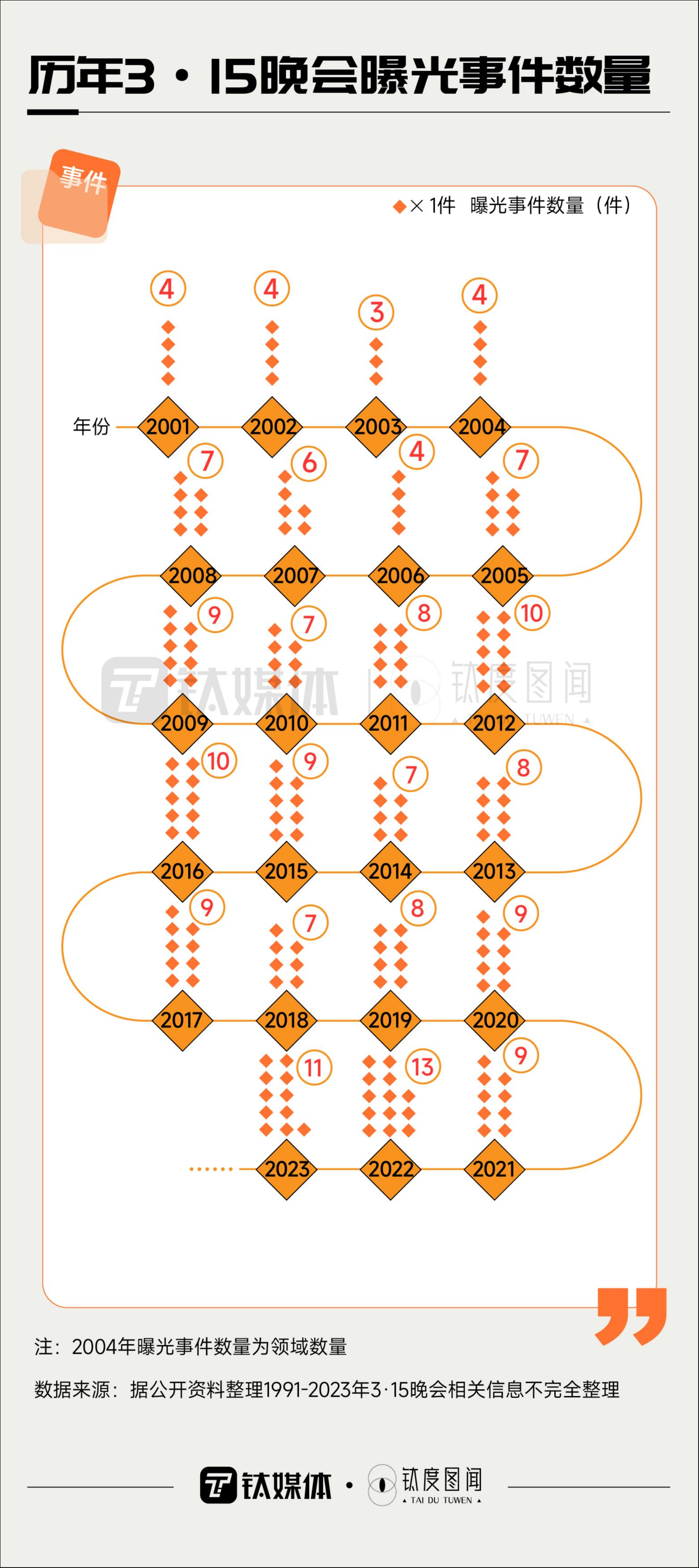 在33年间曝光的169件事件数量中,哪些行业最容易爆雷?有哪些企业被点名?钛媒体·钛度图闻梳理了从1991年-2023年的3·15晚会信息,带你回顾打假历程。