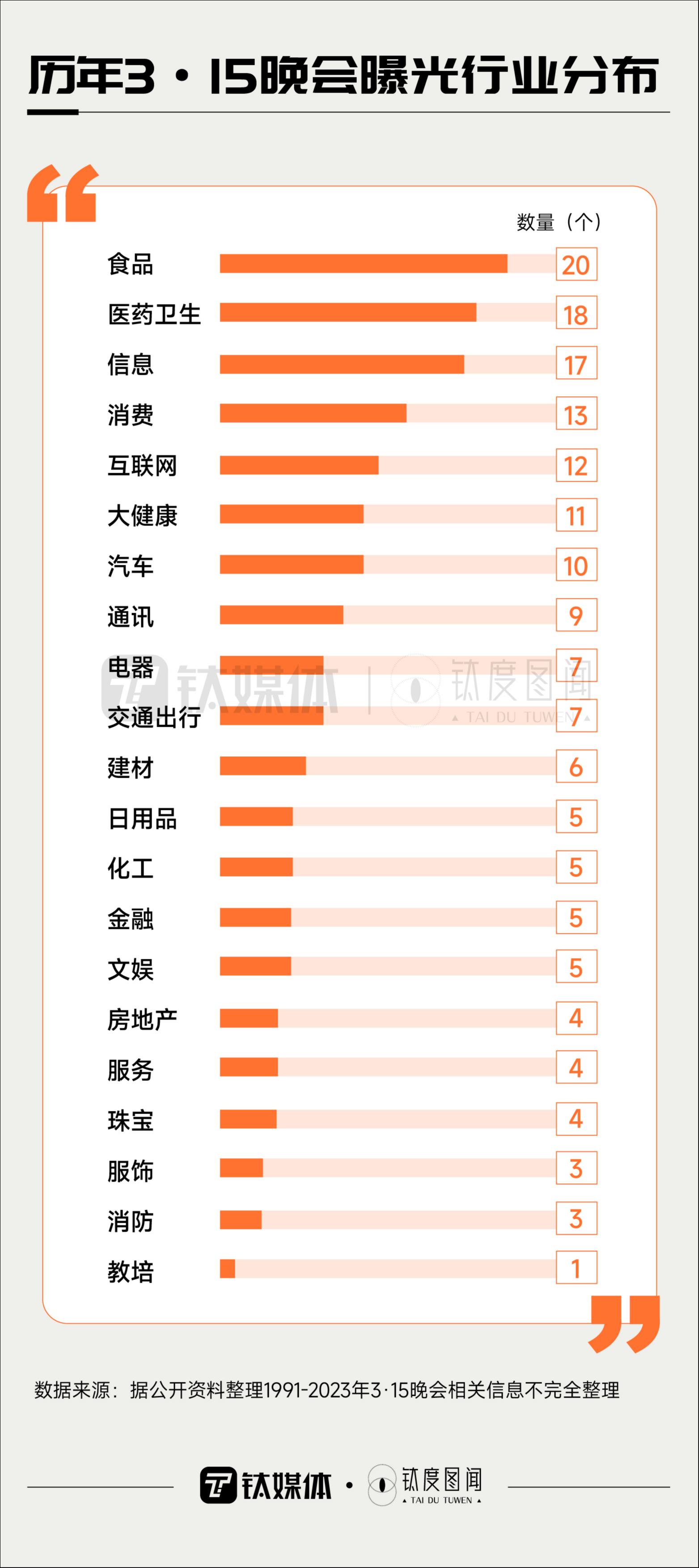 在这30多年来央视3·15晚会曝光的169件信息中,从衣食住行到化工、建材等领域,3·15晚会覆盖了21个相关行业。其中,食品、医药以及信息安全行业是曝光的“重灾区”,进入了行业问题前三名,分别曝光了20次、18次和17次。