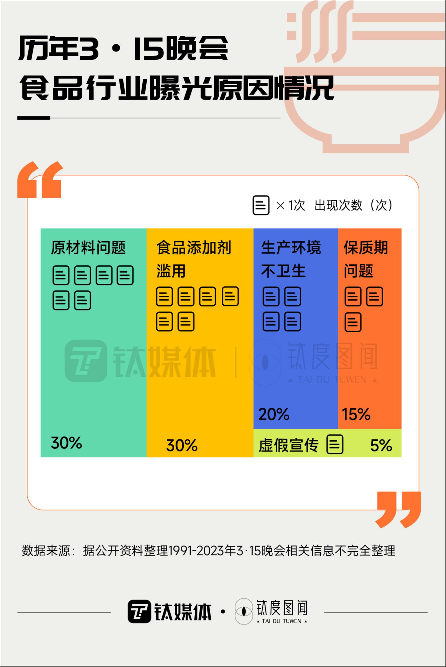 在食品安全这一“重灾区”中,因“原材料处置不当”和“食品添加剂滥用”曝光的事件数量最多,占比均达3成,比如,2001年,部分地区销售的婴儿配方奶粉没有进口卫生证书,食品安全问题开始进入消费者视野;2012年,麦当劳食品掉落地面继续使用,2020年,同是快餐行业的汉堡王又被爆出用过期面包做汉堡等件件引发舆论风波;2023年,香精勾兑“泰国香米”事件一经爆出,电商平台就紧急下架香米香精,涉事企业也被连夜查封。