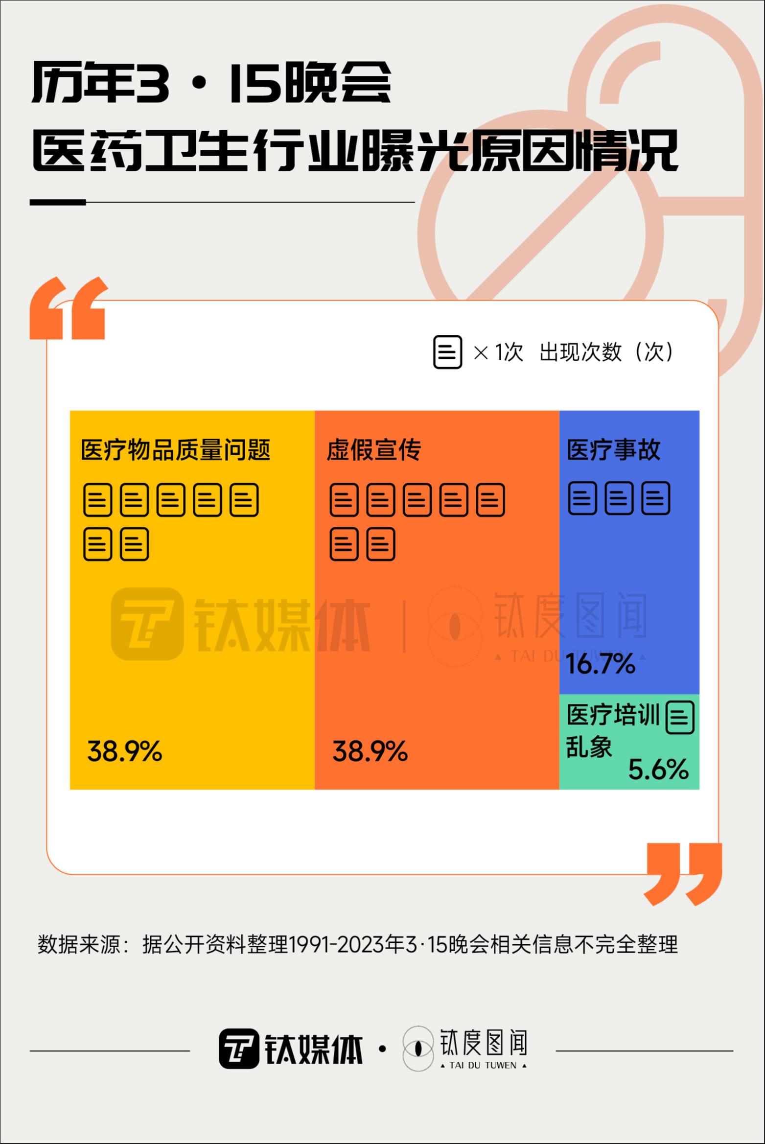 医药卫生行业被曝光的事件数量与信息安全行业旗鼓相当。其中,因“医疗物品质量问题”和因“虚假宣传”而被曝光的多家药物骗局等事件数量相当,均占比近4成;其次,因“医疗事故”原因而被曝光的案例占比近2成,比如“2005年珠海市妇幼保健院对病人因早产吸氧过量而导致双目失明”的事故、“2009年南京一医院违规为9个月大的女孩接种麻腮风疫苗,致其神经性耳聋,并且不可逆转”的事故,件件触目惊心。
