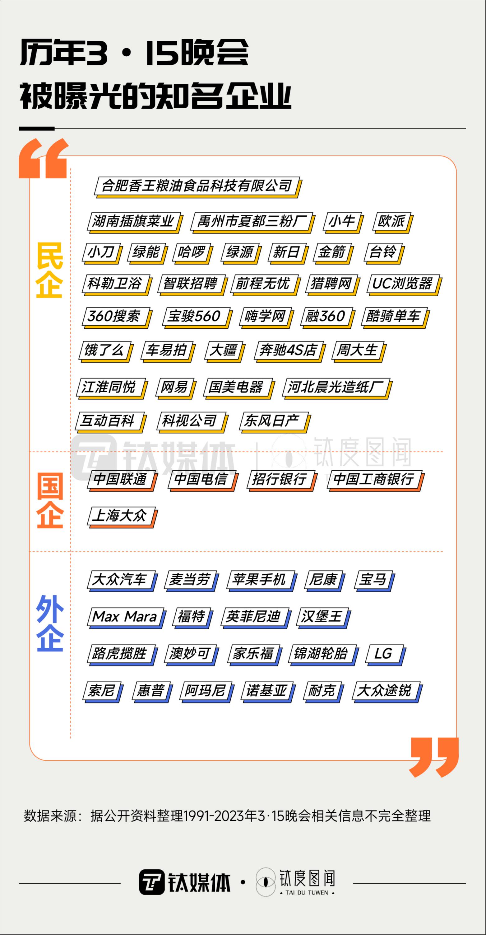 除了曝光行业,3·15晚会也揭露了众多大大小小企业,不管是市值过万亿的上市企业还是初露头角的初创企业,不管是外企还是地方性民企,都曾上榜3·15晚会。