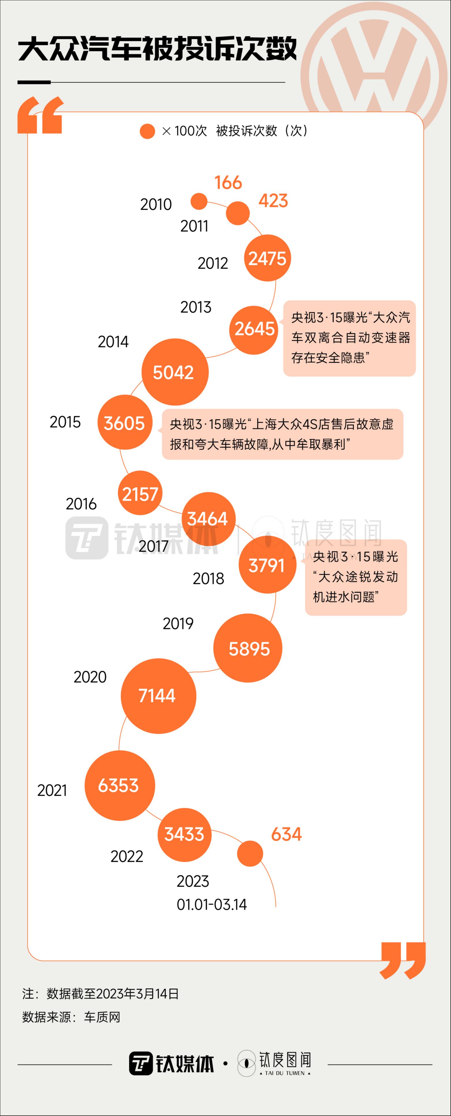 据车质网数据,10多年来,大众汽车被投诉的次数从2010年的166次一度上涨到2020年的7144次,上涨幅度高达43倍,之后有所回落,但2022年仍有3433条投诉。