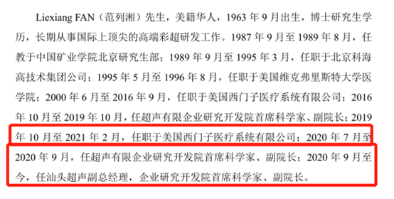 有意思的是,从范列湘的履历上看,其2019年10月至2021年2月任职于美国西门子,2020年7月开始在汕头超声入职。这也意味着,2020年7月至2021年2月,范列湘分别入职于了美国西门子和汕头超声。为何范列湘可以同时在两家公司入职?