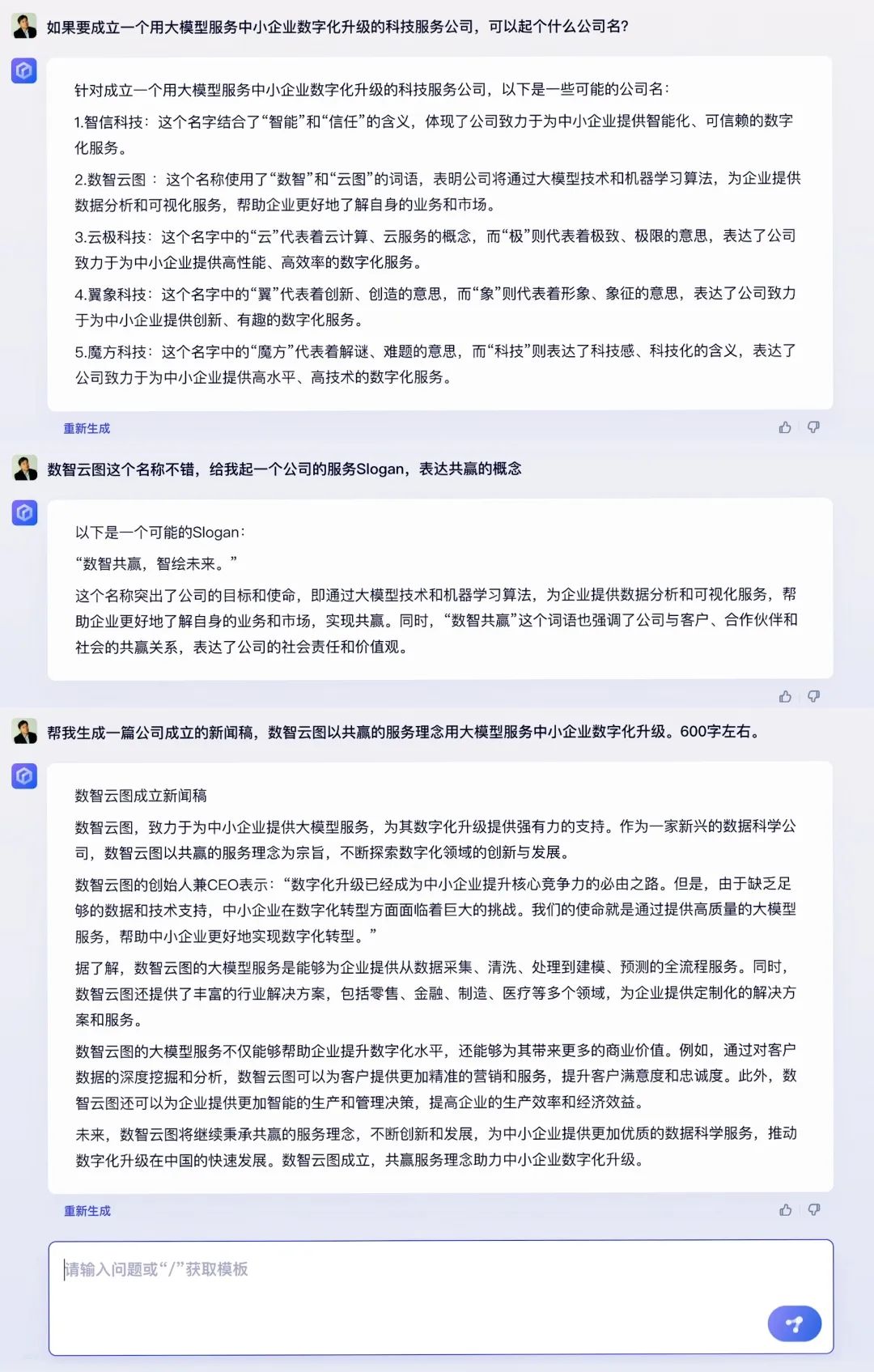 在商业文案创作场景中,文心一言给公司起了名,写了一个Slogan,写出一篇新闻稿。