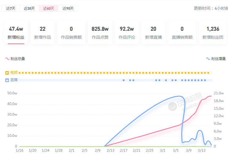 这种质量可以从@导演阿坤 的账号数据来看,根据灰豚数据,账号粉丝从2月12日开始增长后,并没有在某个节点的突然暴涨,除了3月7日后形成传播质变增速,基本画出了一条平滑的上扬线,而这种健康的轨迹来看,话题发酵的潜力仍然很大。