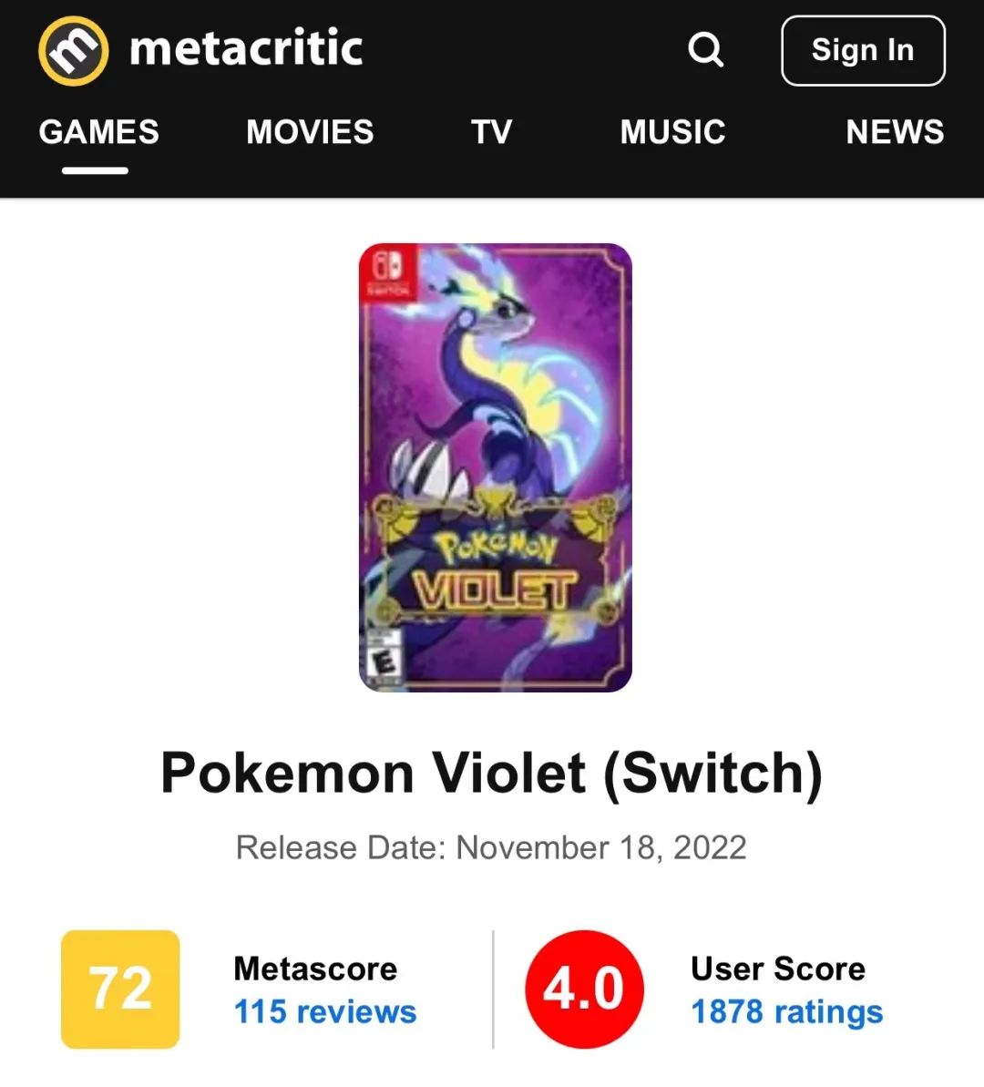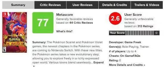 创下了销量纪录后,《朱紫》随后也创下了评分记录。2.6分,这是宝可梦历代游戏中玩家给出的最低评价。
