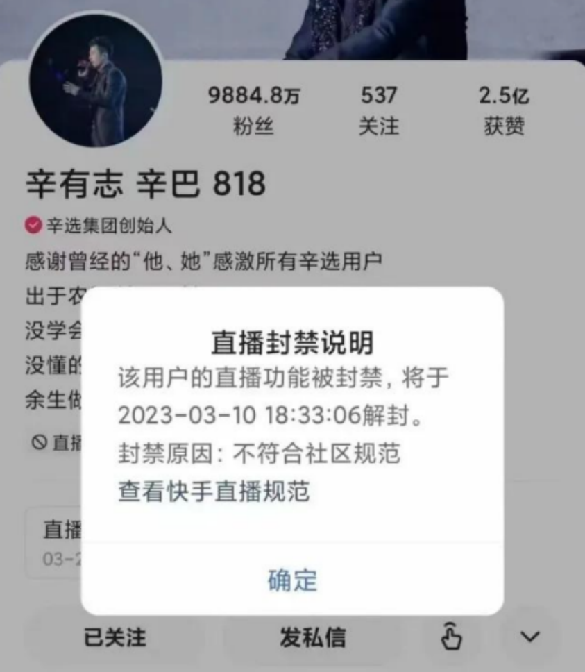 连番炮轰后,辛巴直播间被快手封禁48小时,理由是“不符合社区规范”。