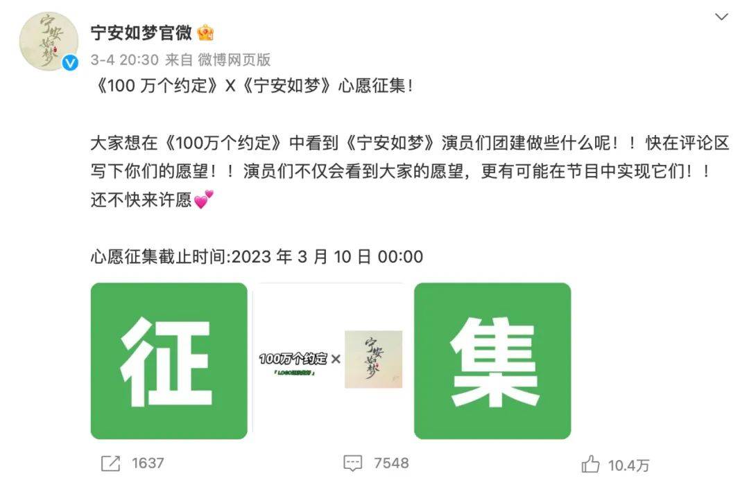 最近爱奇艺预约人数超221.1万的《宁安如梦》传出新消息,不过官博仍未公布剧粉最关心的开播时间,而是抢先为其衍生团综《100万个约定》征集起了心愿。相关招商案披露,这档剧集综艺已经拿到了蒙牛的独家冠名。