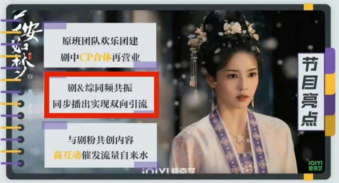 在网传的《100万个约定》策划案中,爱奇艺用“剧&综同频共振”、“同步播出实现双向引流”的字眼形容该项目,暂定3月录制、5月播出的节奏也是为了配合剧播时间,是真正意义上的剧综同步开发。