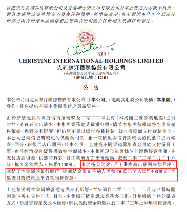 根据3月10日克莉丝汀公告,截至2023年2月28日,集团在店铺租金、供应商货款、员工薪酬方面拖欠约5700万人民币,由于若干供应商已展开法律程序,克莉丝汀集团银行账户被冻结,被冻结金额为350万元至400万元,集团目前依赖股东贷款维持运营。