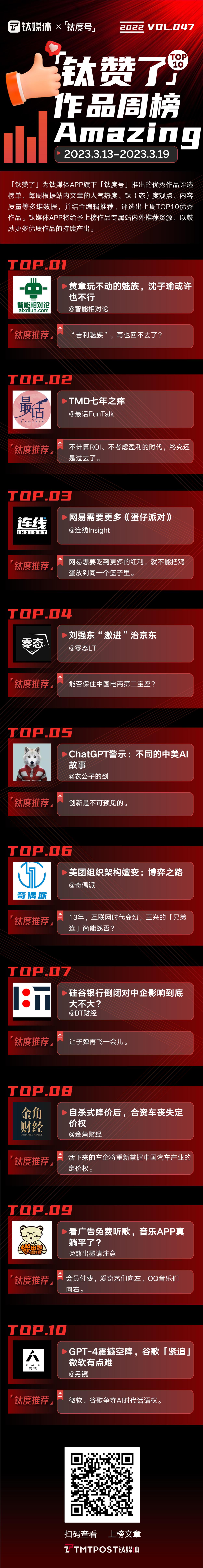2023年3月13日—2023年3月19日,「钛赞了」榜单第47期上榜作品为: