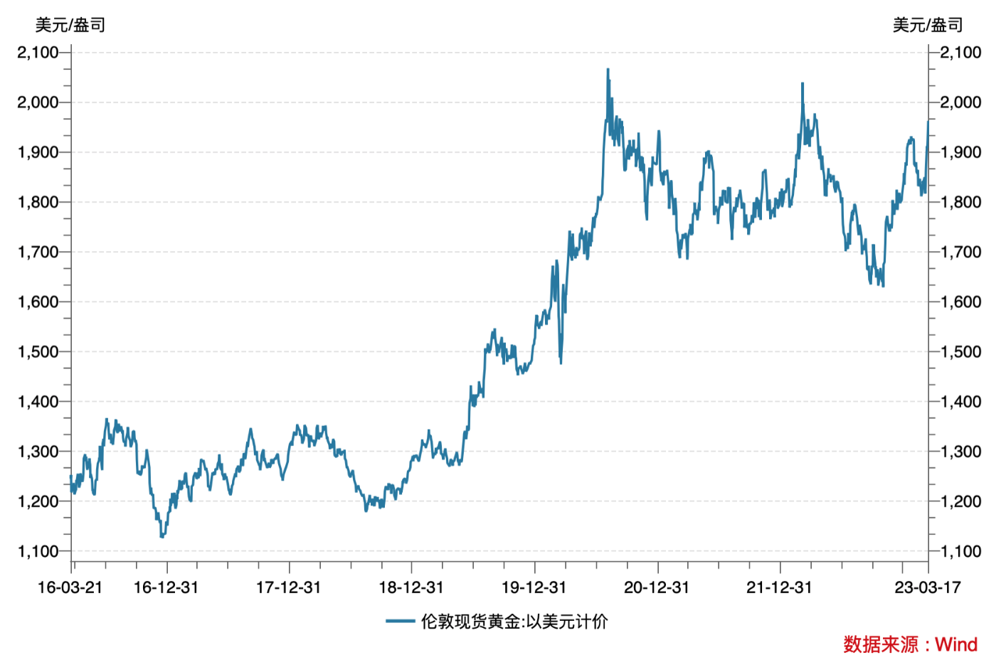 上周受硅谷银行破产、瑞士信贷陷入危机等事件影响,市场避险情绪激增,一举推高了美债、黄金等避险产品的价格。其中,国际黄金价格正逼近2000美元大关,离两年前的历史高点近在咫尺。截至3月17日收盘,纽约黄金期货收于1993.7美元/盎司,周内涨幅6.5%;伦敦现货黄金价格收于1983.47美元/盎司,周内涨幅6.3%。