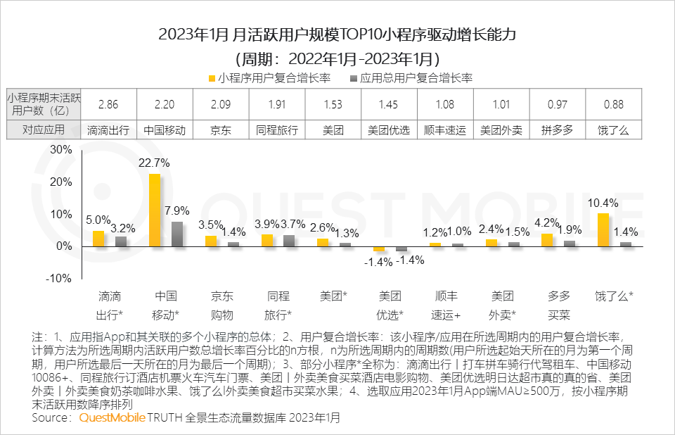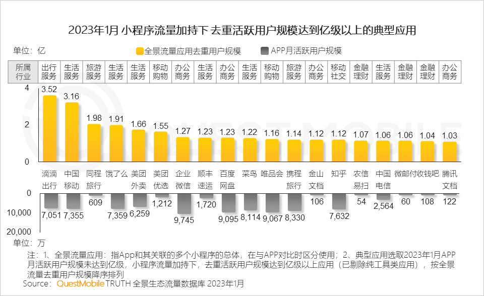 QuestMobile数据显示,2023年1月,19款应用在小程序流量加持下实现亿量级突破。
