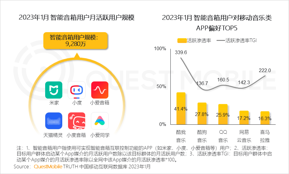QuestMobile数据显示,截止2023年1月,喜马拉雅智能硬件生态流量达7,237万,占其全景生态流量的25.7%。
