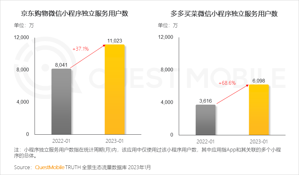 QuestMobile数据显示,截止2023年1月,京东旗下京东购物微信小程序、拼多多旗下多多买菜微信小程序独立服务用户数为1.10亿和6,098万,同比增速分别达到37.1%、68.6%。