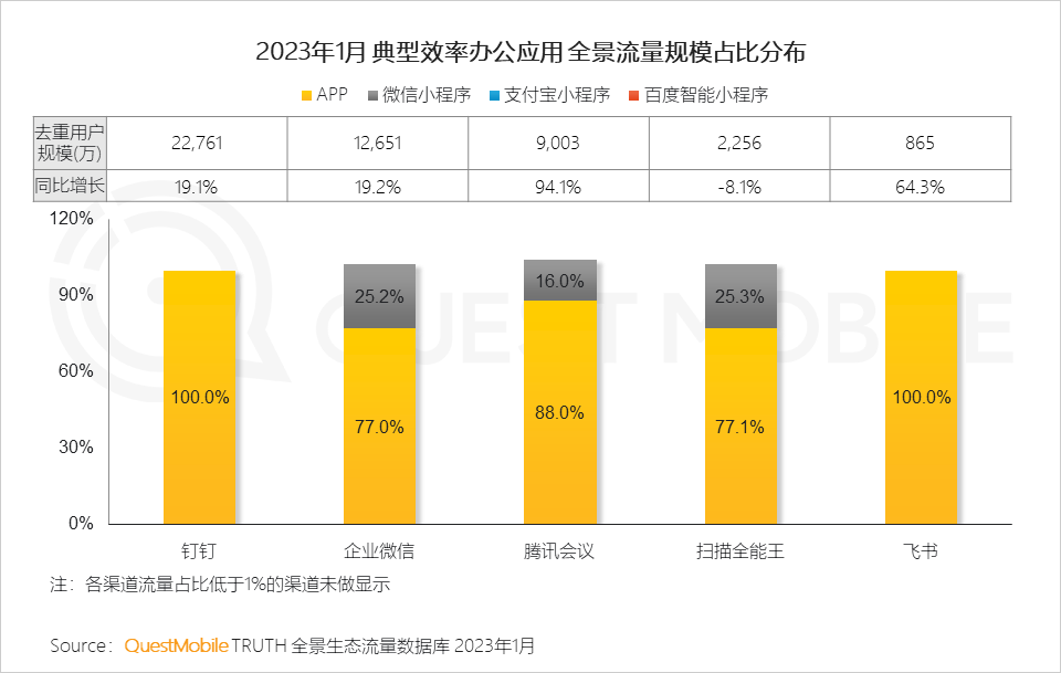 QuestMobile数据显示,钉钉、企业微信全景流量均达到亿量级,腾讯会议、飞书发展迅速,同比增速分别为94.1%、64.3%。