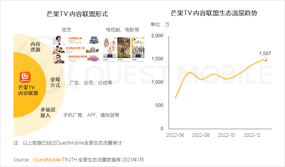 芒果TV通过内容联盟形式输出内容资源,在帮助联盟平台提升用户粘性、实现商业变现的同时自身也收获生态流量, QuestMobile数据显示,截止2023年1月,芒果TV内容联盟生态流量已突破1,500万。