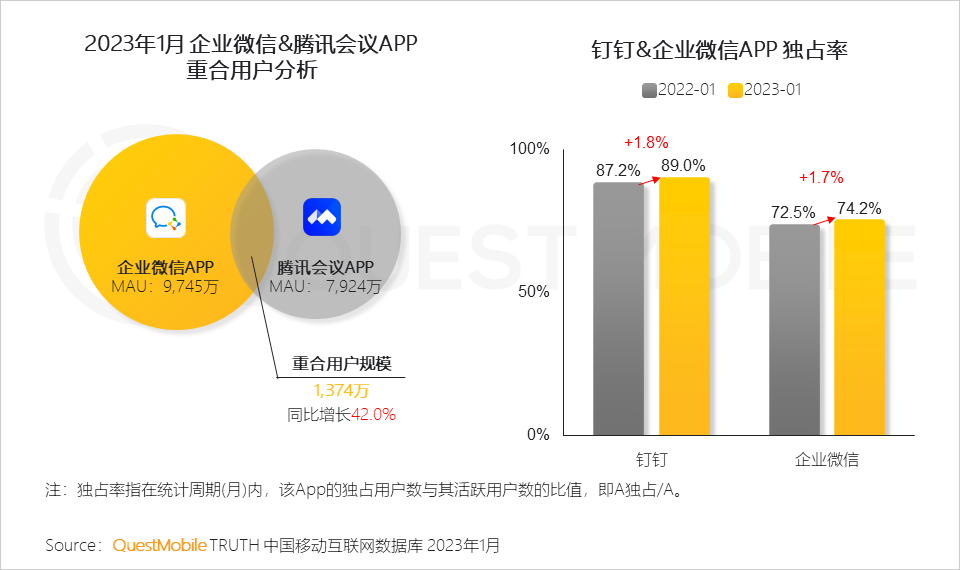 3.2 腾讯加深产品互通连接,企业微信与腾讯会议重合用户规模超千万;钉钉、企业微信用户规模增长的同时独占率保持提升,反映出效率办公市场充足的增量空间