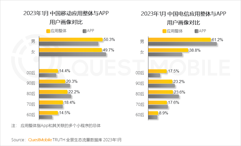 1.2 随着运营商小程序功能愈加丰富完善,相较于APP用户结构,中国移动、中国电信全景流量覆盖更多年轻、银发群体