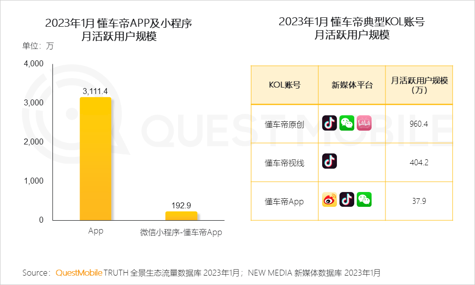 懂车帝在APP、小程序流量之外,通过矩阵KOL账号布局新媒体平台,取得良好收效,QuestMobile数据显示,2023年1月,懂车帝旗下懂车帝原创、懂车帝视线KOL账号月活跃用户规模分别为960.4万、404.2万。