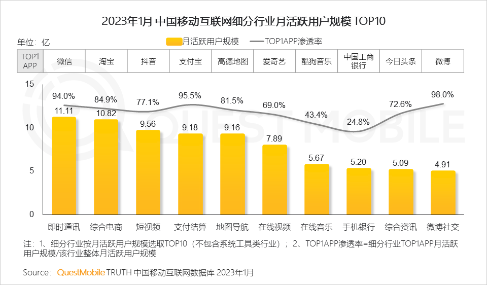 导语:今天就给大家分享一下全景生态流量春季报告。QuestMobile数据显示,随着全网用户规模突破12亿,日常APP使用趋于稳定,2023年1月,用户月人均使用APP 26.8个,少于去年同期的27.3个。同时,流量加速向头部集中,TOP10行业中,包括即时通讯、综合电商、短视频、支付结算、地图导航、在线视频、综合资讯、微博社交在内的八大领域,头部APP的渗透率接近7成以上!