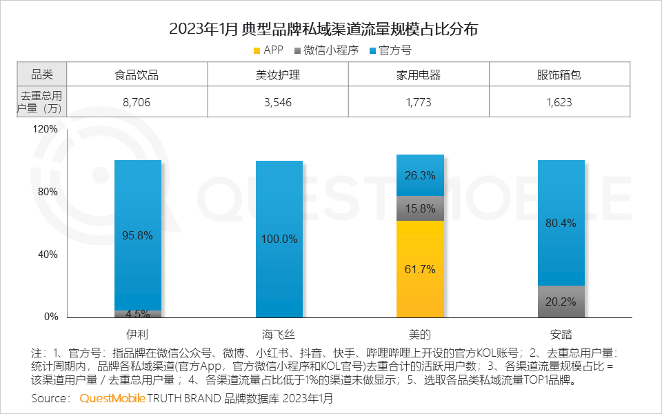 不过,依附超级APP的小程序生态、新媒体官方号生态等,发展速度呈现加速趋势,“APP+小程序+新媒体”,形成了新的发展格局生态。截止到2023年1月,在微信、支付宝、百度等小程序平台流量加持下,去重用户量过亿的应用服务商已经突破19款;传统品牌商则更多使用新媒体官号构建私域流量池。