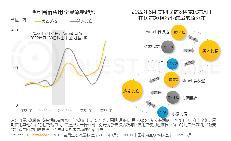 随着Airbnb爱彼迎退出中国大陆市场,本土民宿平台实现流量承接,QuestMobile数据显示,2022年6月,美团民宿、途家民宿APP在民宿短租行业流量来源中,Airbnb爱彼迎APP的流量占比均在六成以上。